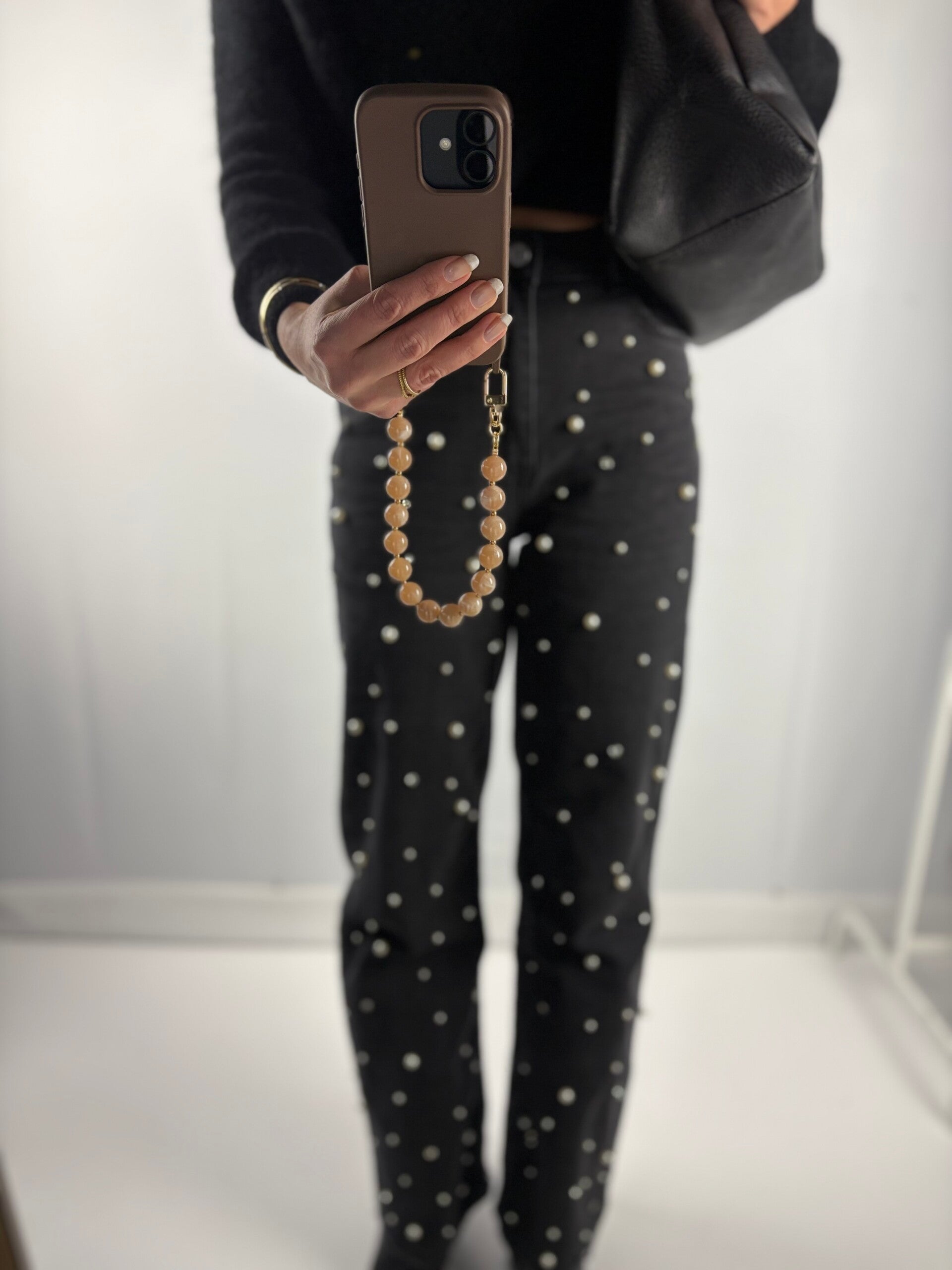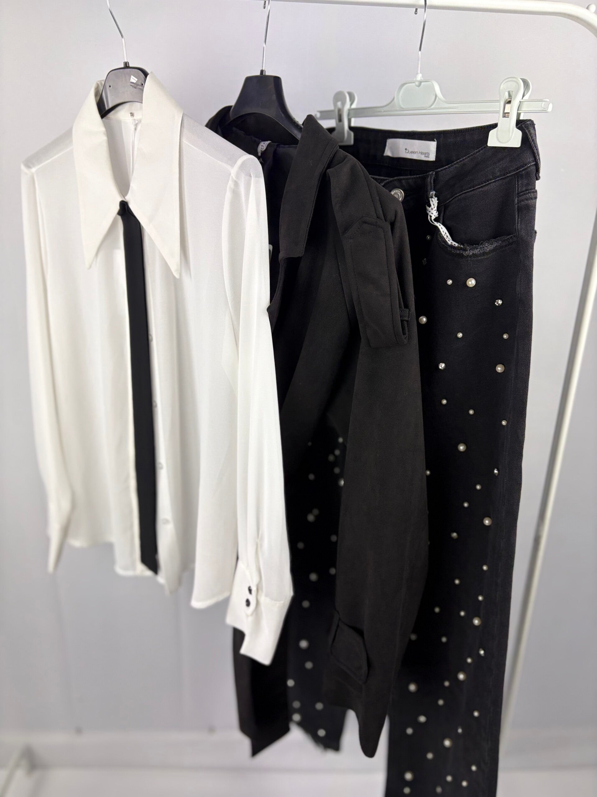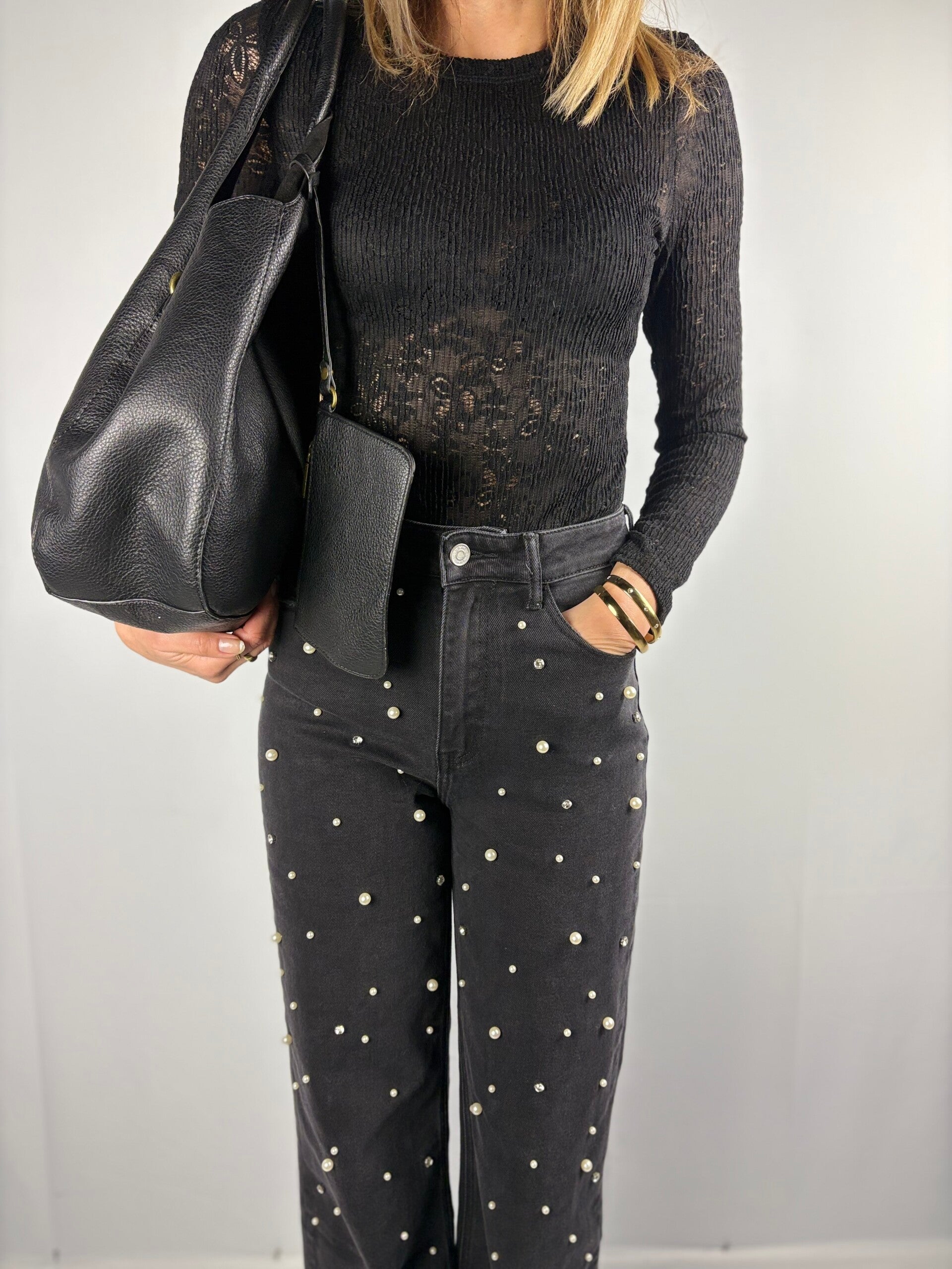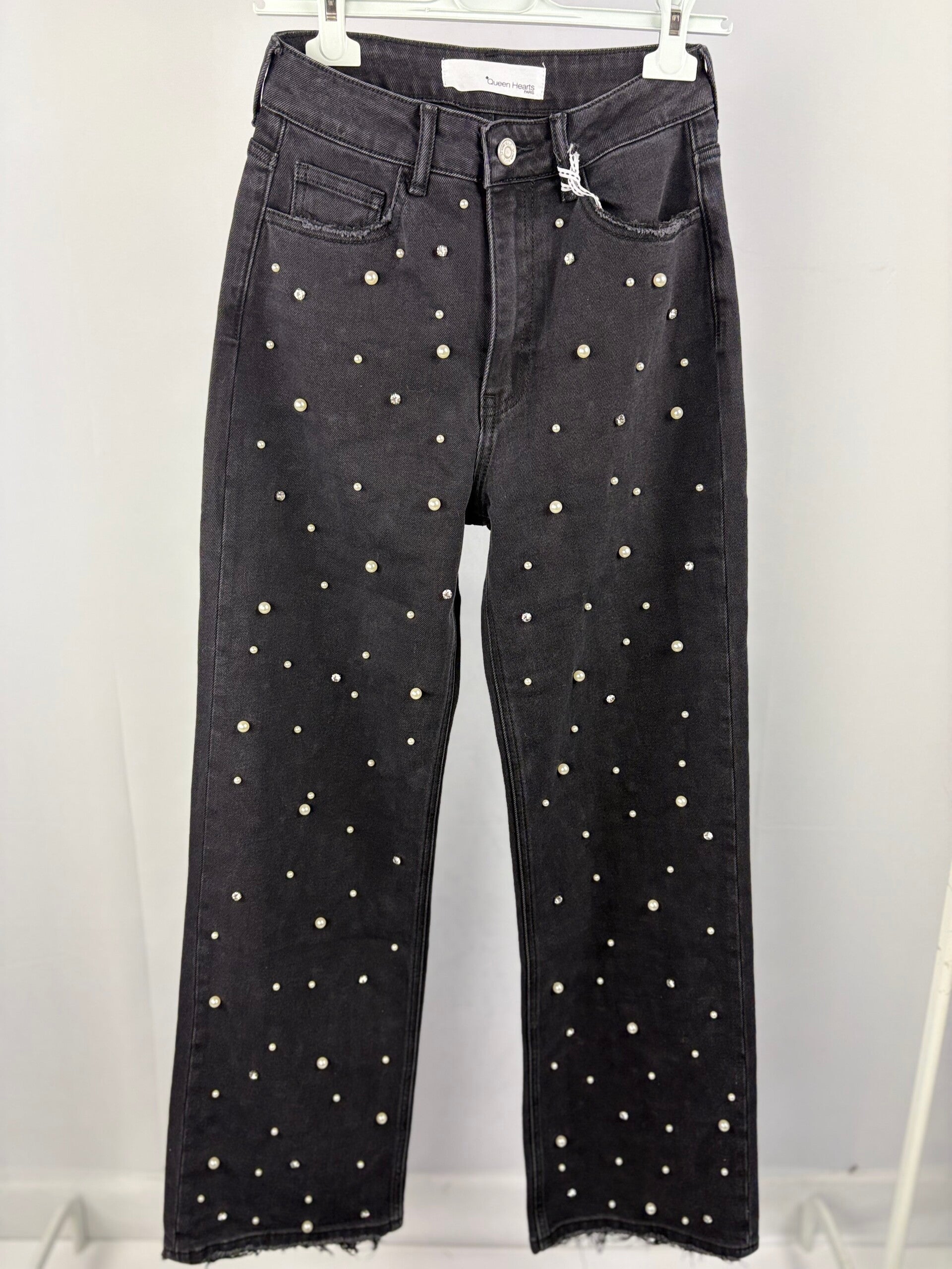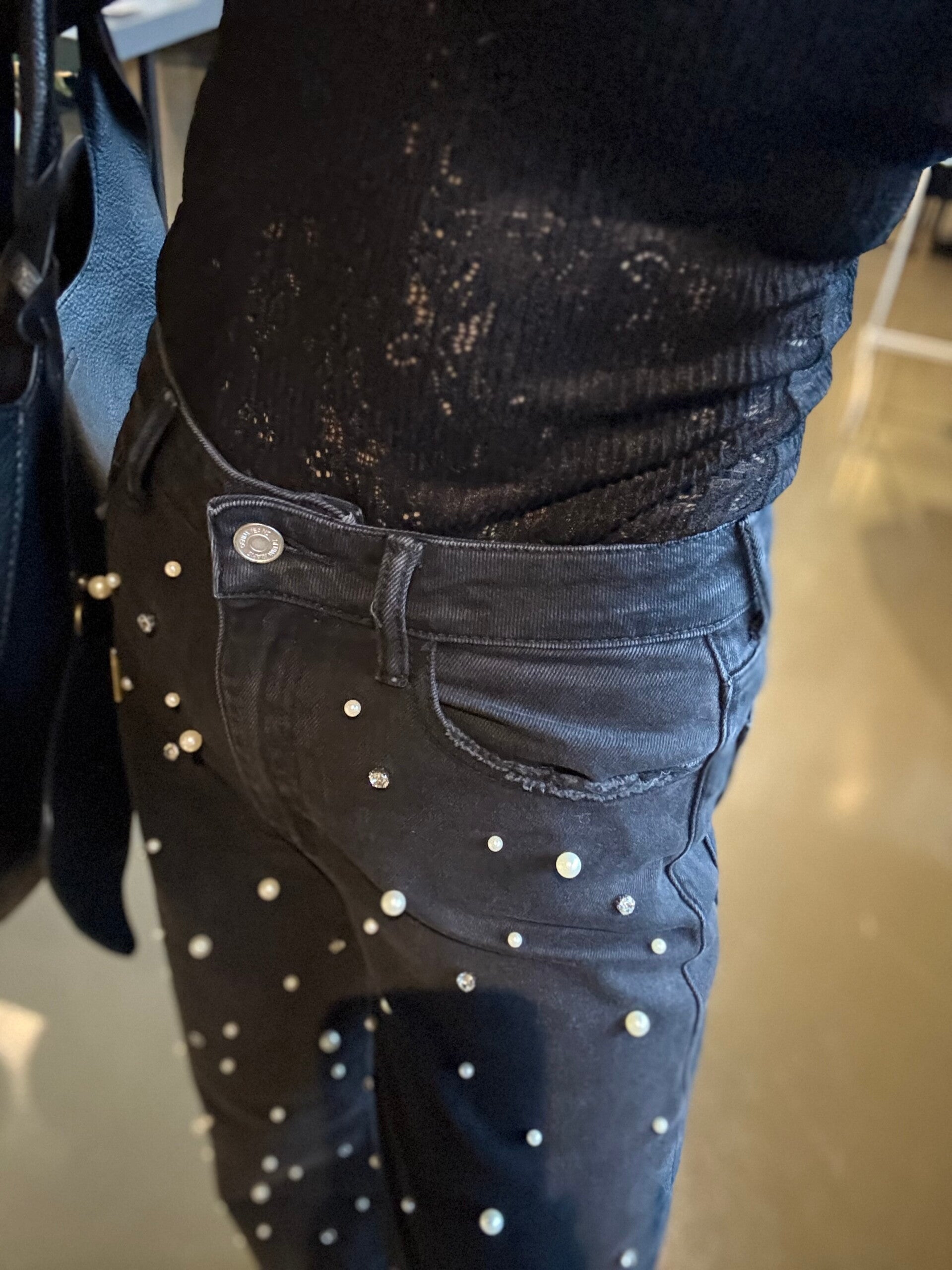 De jeans met parels. De parels zitten alleen aan de voorzijde van de broek. hij is verkrijgbaar in maat 38