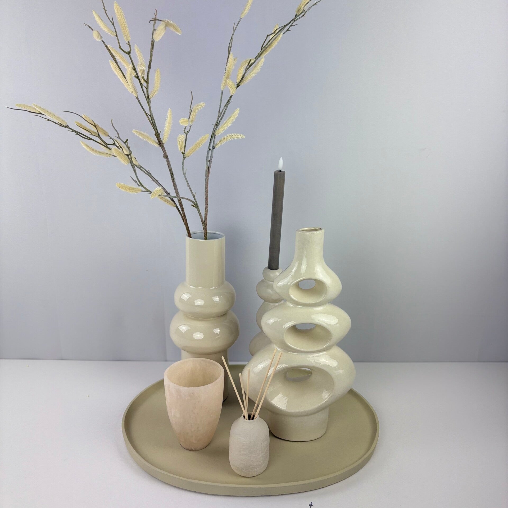 Deze compleet gestylde set in de kleuren beige/zand bestaat uit 7 stuks, waarvan een plateau ovaal van 50cm lang en 40cm doorsnede, een vaas met tak, kaarsenstandaard met één led dinerkaars, nog een vaas [ringen] geurstokjes in potje en waxinelichthouder.