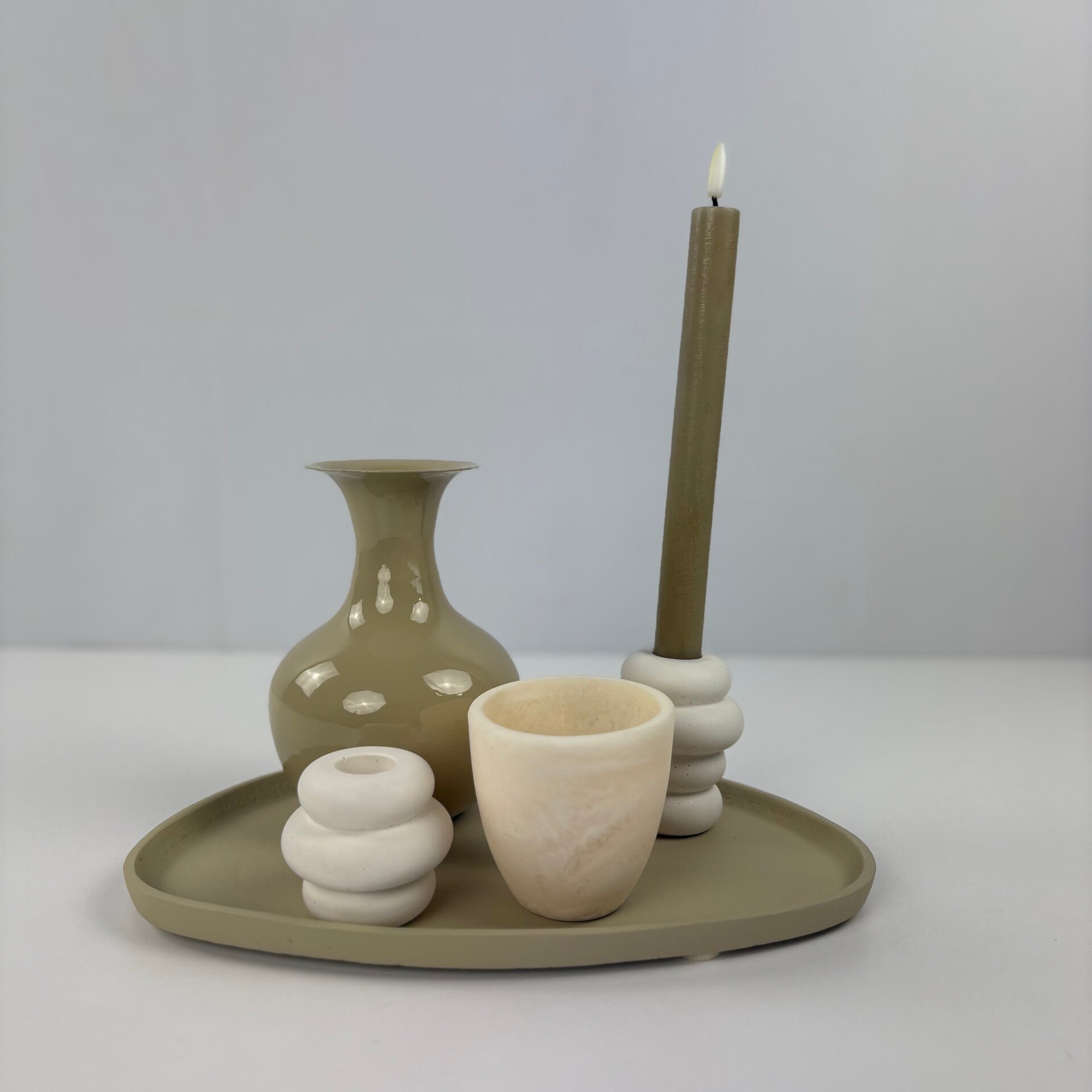 Dit compleet gestylde setje bestaande uit 6 stuks bevat een plateau in de kleur zand is 30cm lang en 20cm doorsnede, een vaasje, windlichtje en 2 stuks kaarsenhouders waarvan één met led dinerkaars.